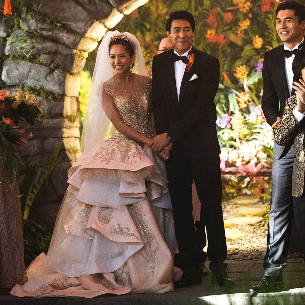 Carven Ong showcases exceptional artistry in costume design through a series of bespoke creations crafted for a major blockbuster film styled by Mary E. Vogt. Among the most memorable is the extravagant wedding ensemble worn in the iconic on-screen ceremony—an innovative multi-layered look combining a sheer Swarovski-encrusted jumpsuit with a dramatic overskirt, designed to accentuate the actress’s ballet-trained silhouette.