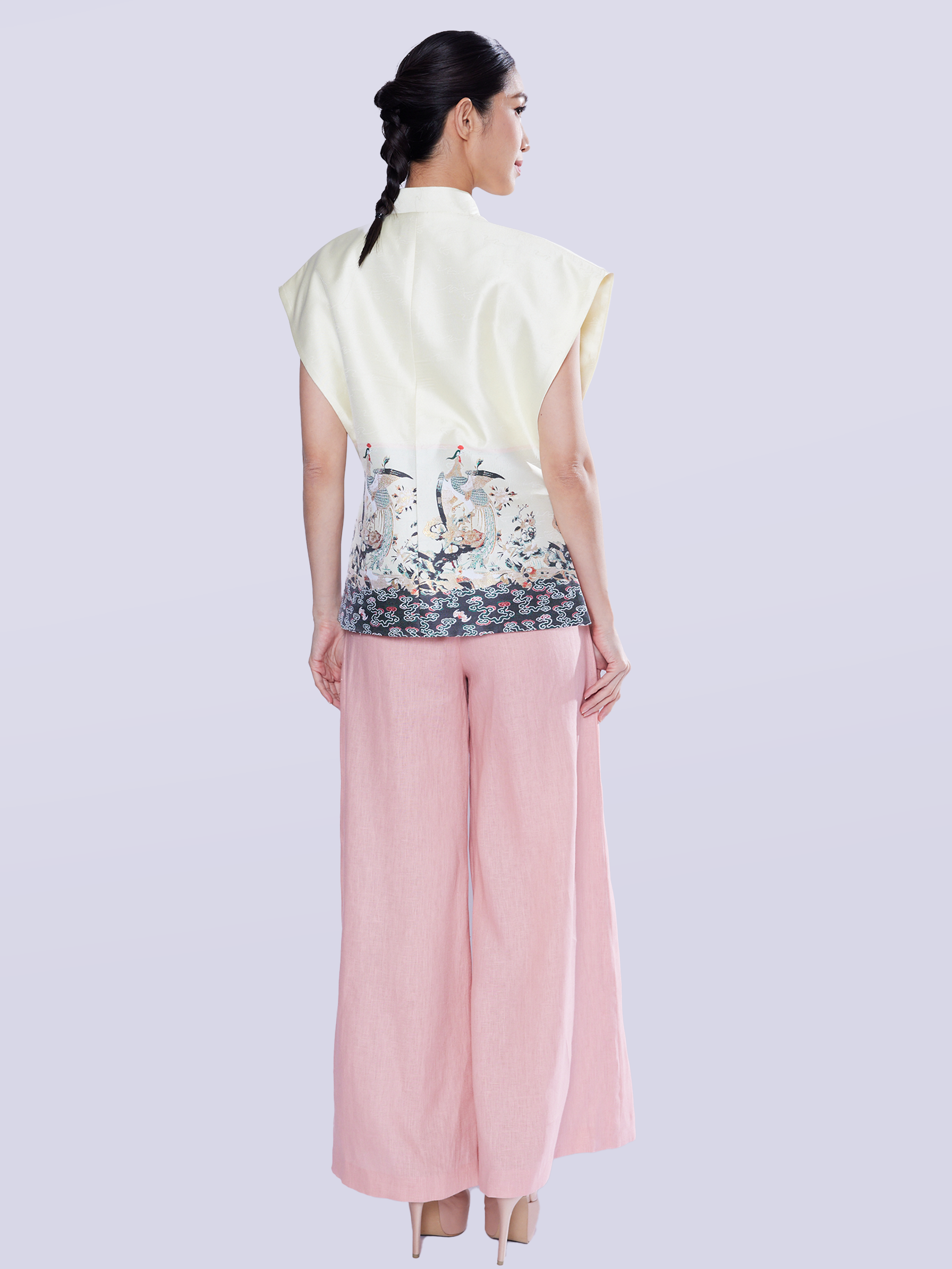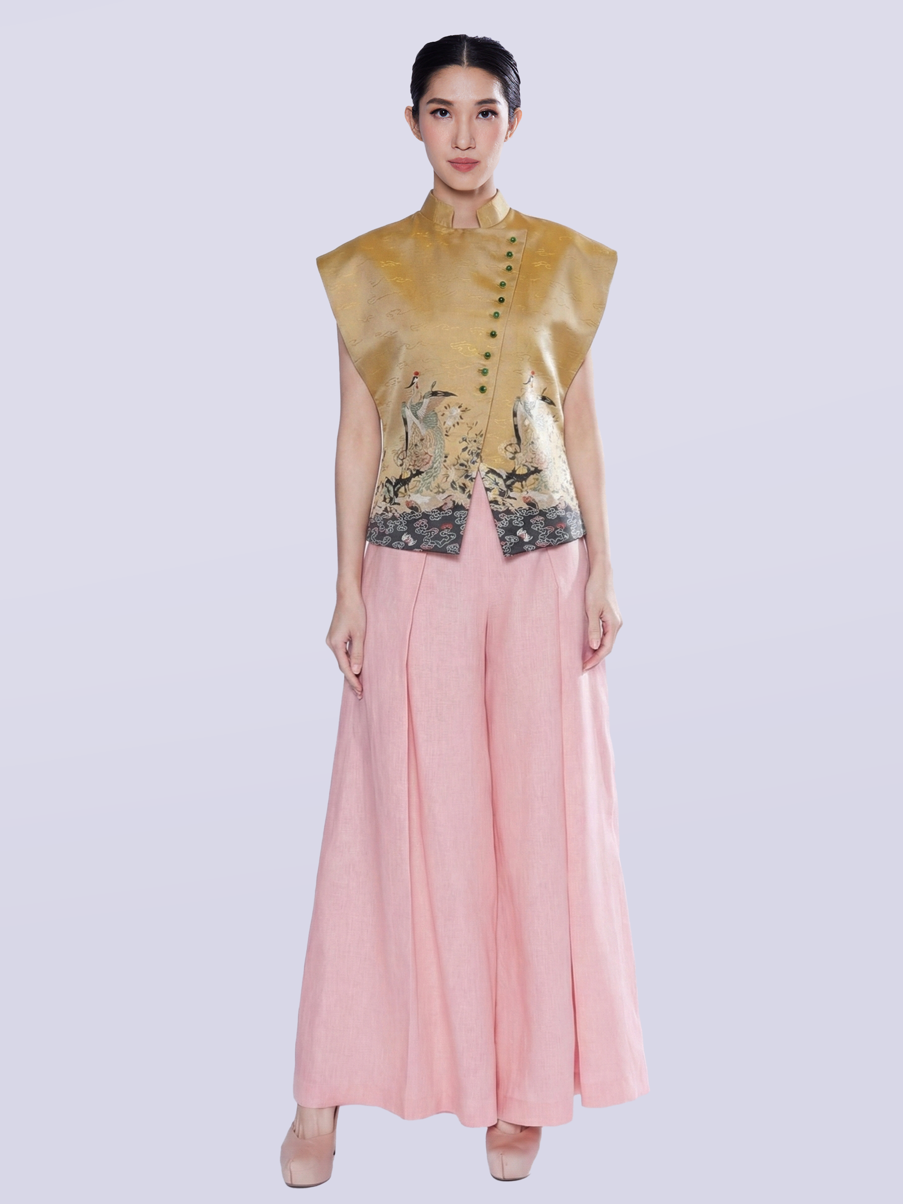 The outfit presents a combination of traditional luxury and contemporary tailoring, featuring a beautiful brocade blouse designed with a luxurious cut silhouette. The chic high-necked design is enhanced with a sophisticated asymmetrical overlay closure, elegantly detailed with contrasting jade green glass buttons. This piece is defined by its sharp structure and luxurious fabrics, offering a refined and modern statement look that combines rich textures with a sharp fashion aesthetic.