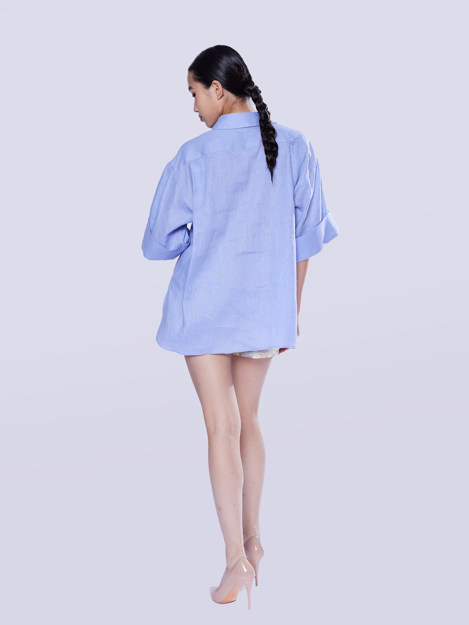 Oversized utility shirt crafted from a breathable pure linen, designed with a contemporary boxy silhouette hanging loosely on the frame. It features a relaxed design defined by dropped shoulders, double flap chest pockets for a touch of utilitarian style, and a modern finish including a button front, classic collar, and dynamic high-low hem with practical side holes.