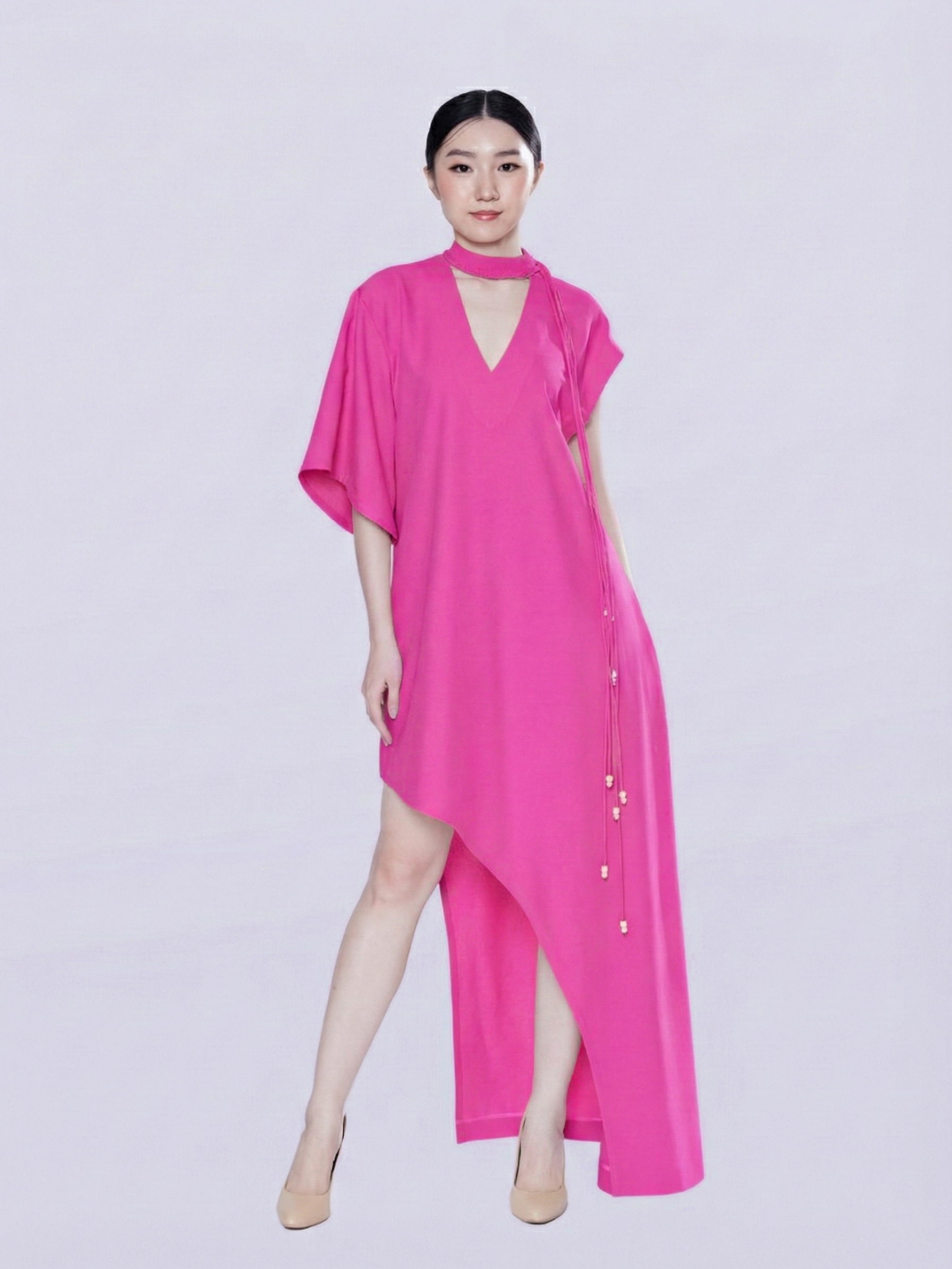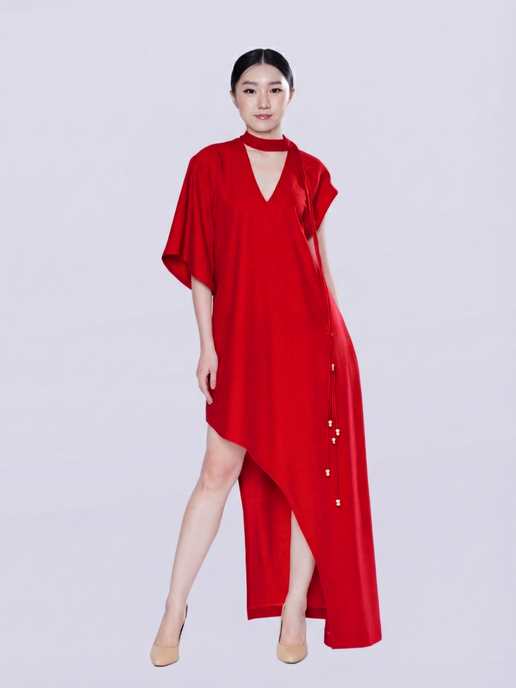 Long Dress made of beautiful multi-toned pure linen fabric that perfectly holds the shape of a large, yet delicate dress. The silhouette is a high-fashion in modern draping, defined by a sophisticated high neckline with a plunging V-neck cut and a dramatically asymmetrical waistline that offers unexpected glimpses of the legs, giving the wearer comfortable movement.